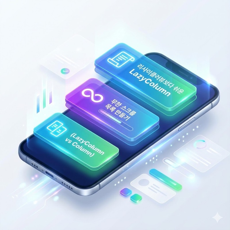 **LazyColumn**은 이름처럼 '게으르게' 작동합니다. 지금 화면에 보이는 아이템만 그리고, 나머지는 스크롤을 내릴 때 그때그때 그립니다. 덕분에 데이터가 10,000개라도 앱은 아주 매끄럽게 돌아갑니다.